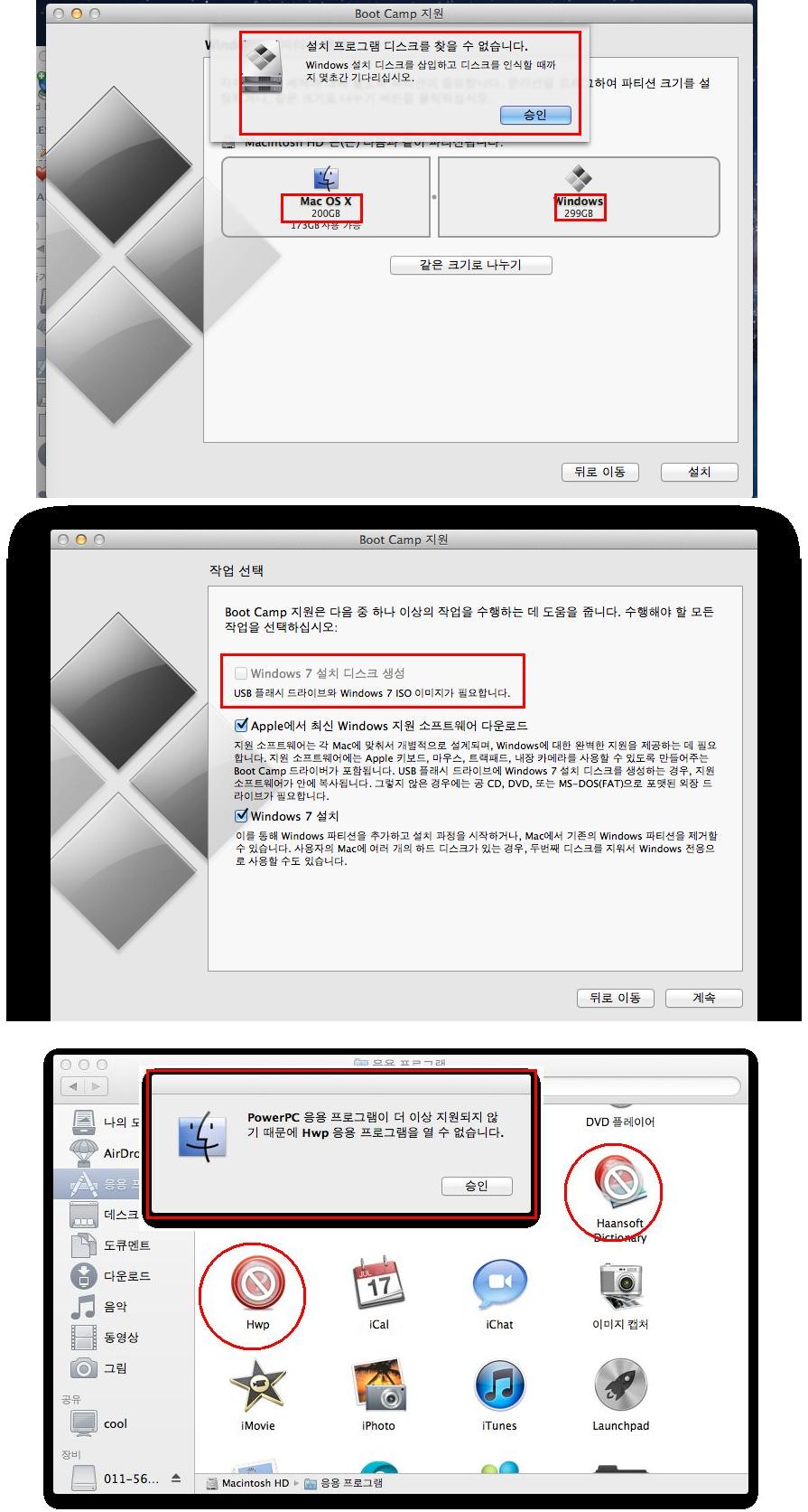 맥 부트캠프에서, "애플지원 소프트웨어 다운, 윈도7 설치"를 체크했는데, "설치프로그램을 찾을수 없다"고 하네요. (그림 맨 위에꺼)
