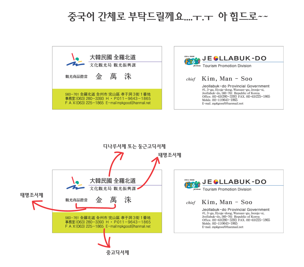 중국어 간체로 명함글씨 아웃라인 부탁드려요...ㅜ.ㅜ 혀리 일반 0 7209 2007.02.06 19:47 -0001.11.30 00:00 jj.ai (0byte) + 34 아무리 방법을 모색해도 할수가 없네요... 오늘 인쇄해야하는데..ㅜ.ㅜ 염치불구하고 올려봅니다...부탁드릴께요...ㅜ.ㅜ